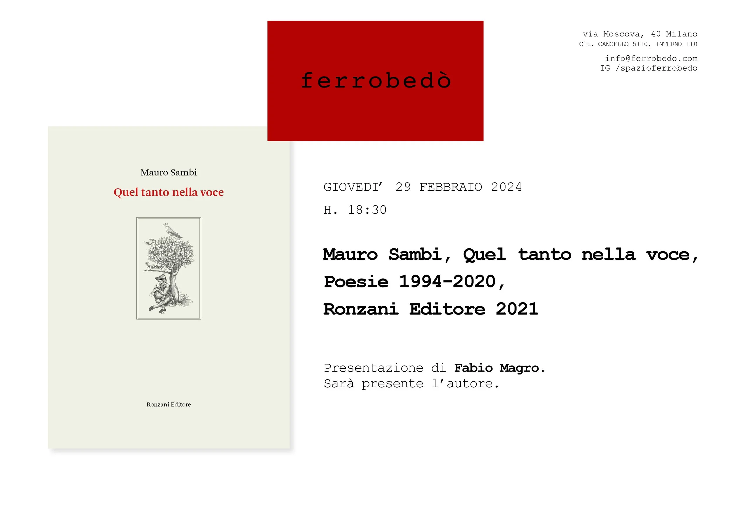Mauro Sambi, Quel tanto nella voce, Poesie 1994-2020 giovedì 29 febbraio 2024 18:30 20:30 Via Moscova 40 Milano, Lombardia, 20121 Italia (mappa) Google Calendar ICS