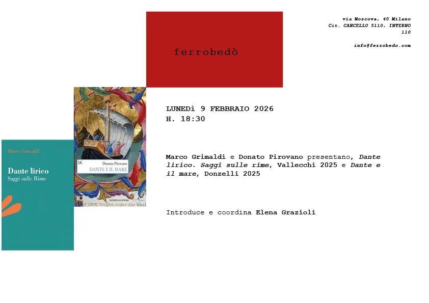 Marco Grimaldi e Donato Pirovano presentano Dante lirico. Saggi sulle rime, Vallecchi 2025 e Dante e il mare, Donzelli 2025 lunedì 9 febbraio 2026 18:30 20:00 Via Moscova 40 Milano, Lombardia, 20121 Italia (mappa) Google Calendar ICS