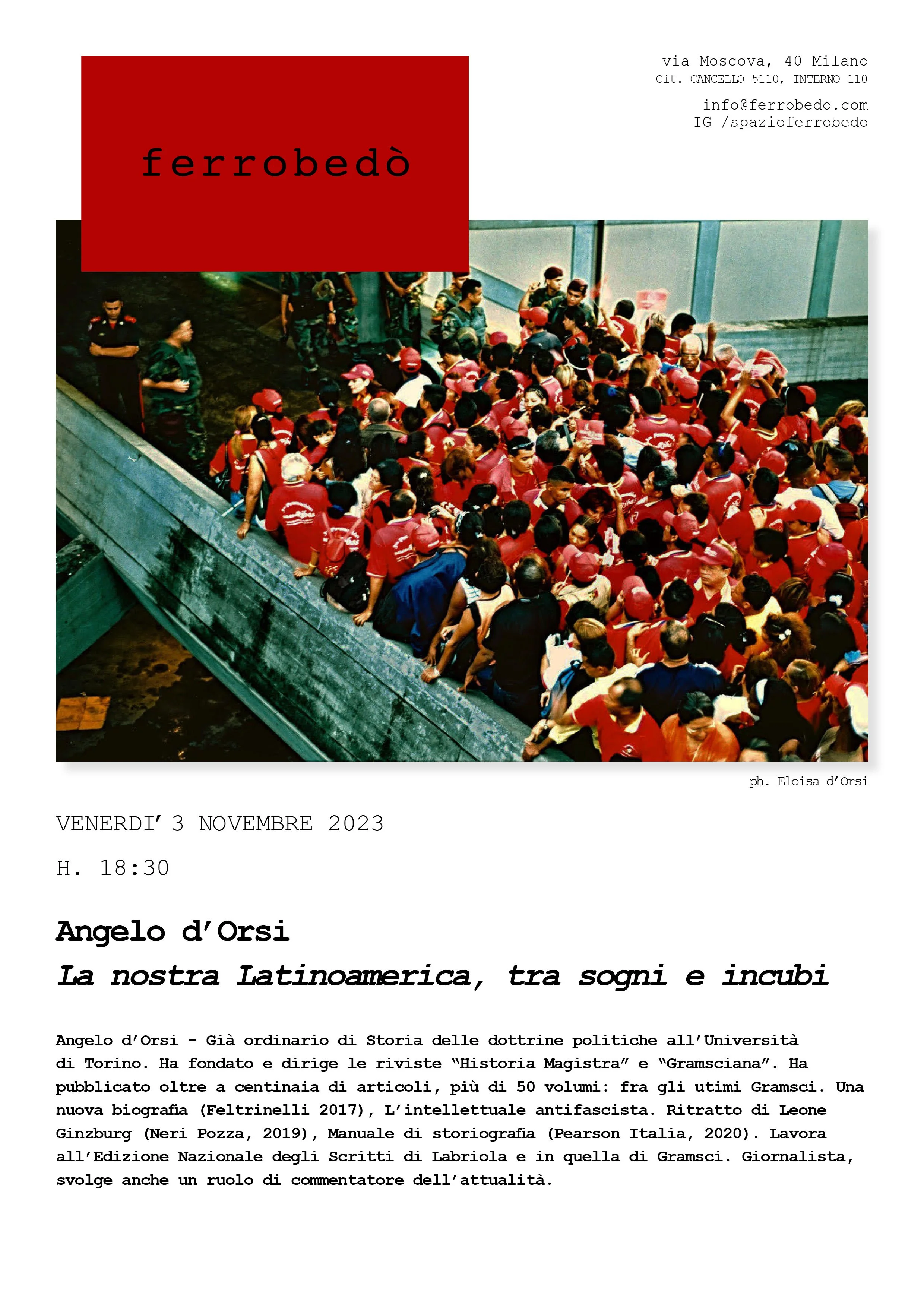 Angelo d’Orsi - La nostra Latinoamerica, tra sogni e incubi venerdì 3 novembre 2023 18:30 20:30 Via Moscova 40 Milano, Lombardia, 20121 Italia (mappa) Google Calendar ICS