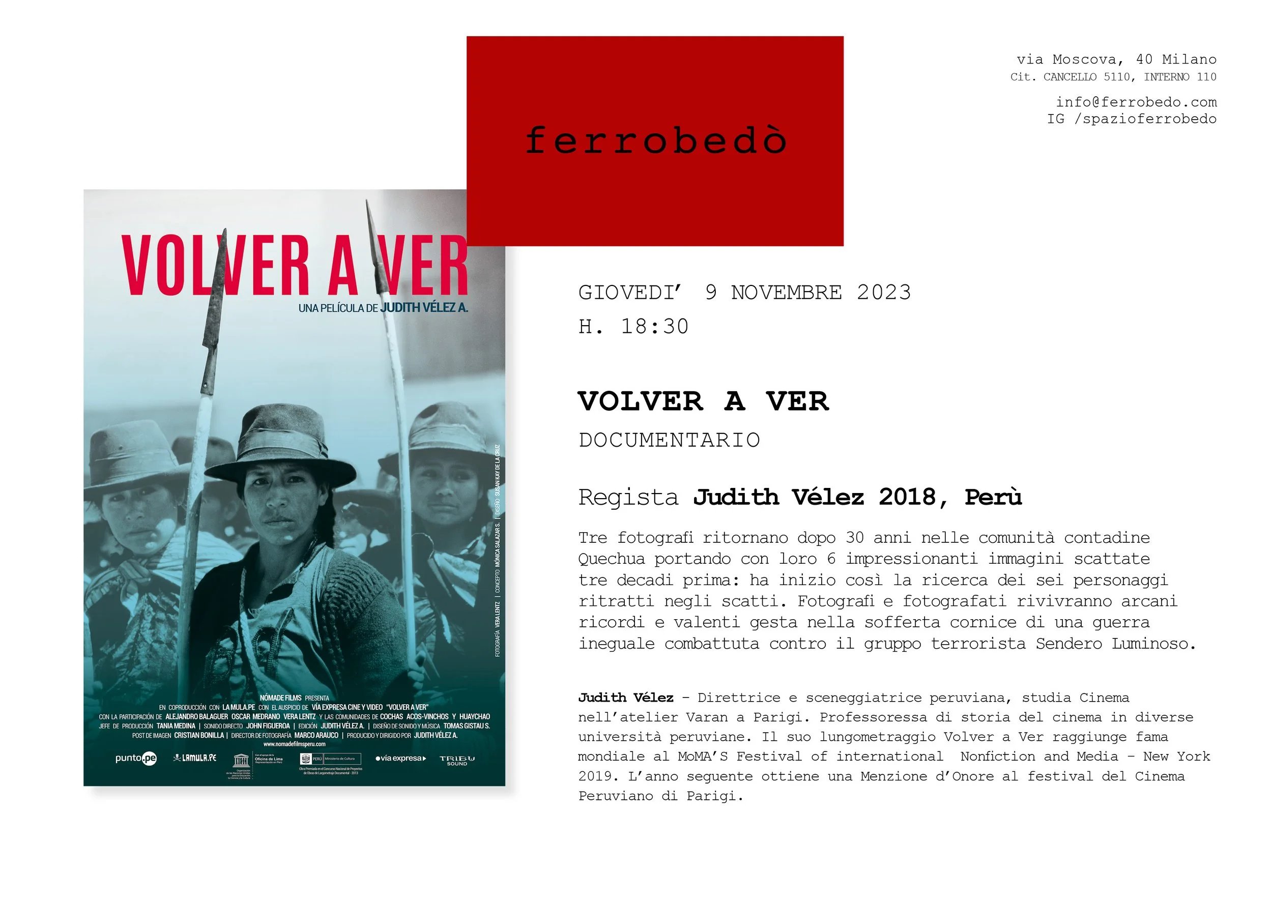 VOLVER A VER, DOCUMENTARIO - Regista Judith Vélez 2018, Perù giovedì 9 novembre 2023 18:30 20:30 Via Moscova 40 Milano, Lombardia, 20121 Italia (mappa) Google Calendar ICS