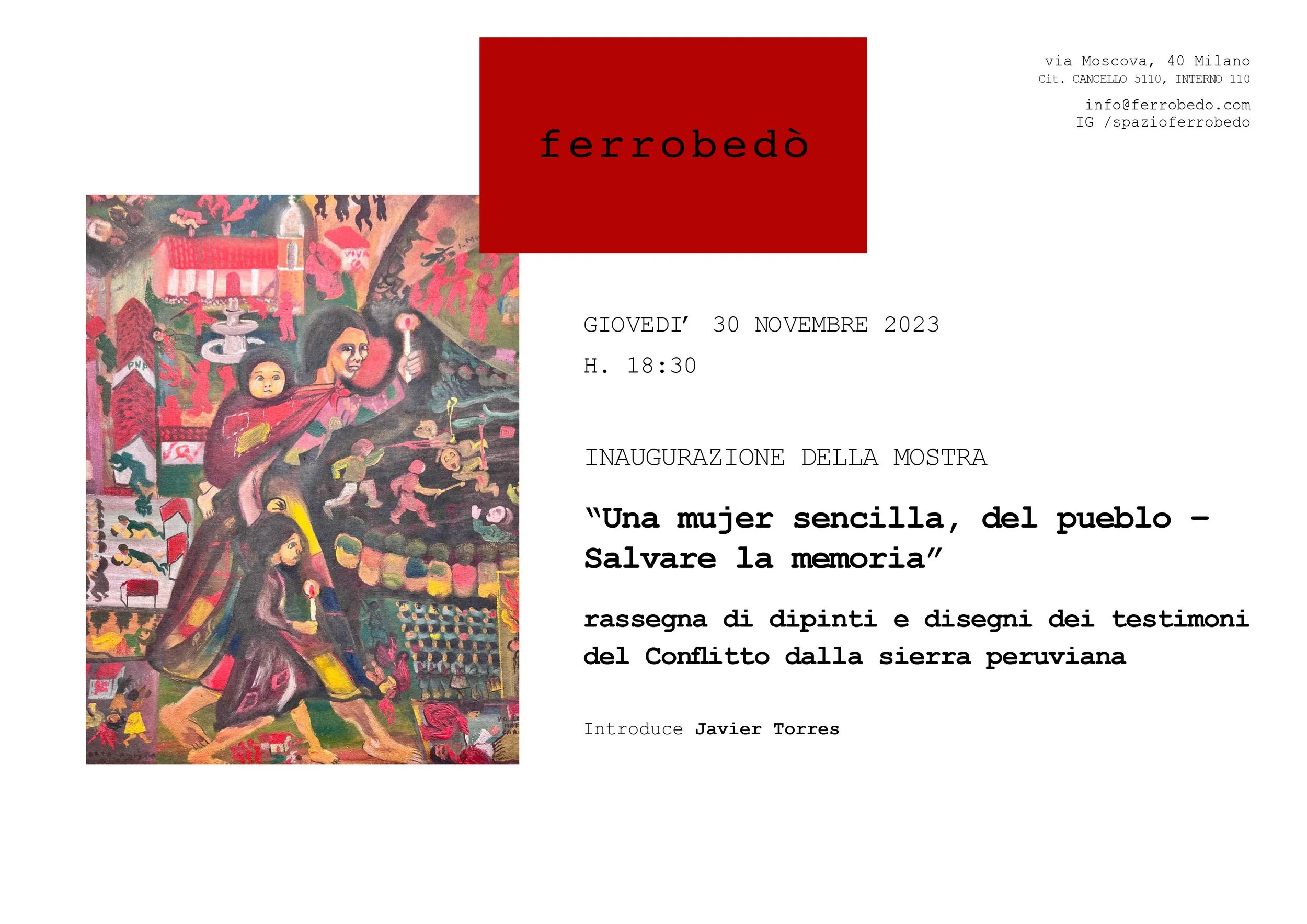 “Una mujer sencilla, del pueblo – Salvare la memoria” rassegna di dipinti e disegni dei testimoni del Conflitto dalla sierra peruviana giovedì 30 novembre 2023 18:30 20:30 Via Moscova 40 Milano, Lombardia, 20121 Italia (mappa) Google Calendar ICS