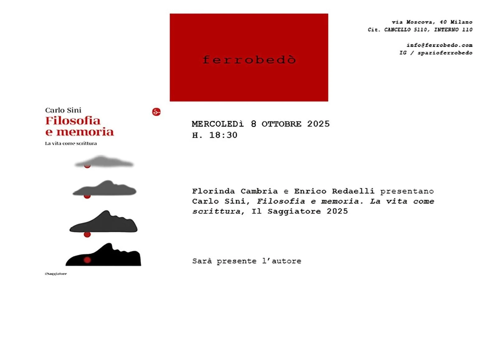 Florinda Cambria e Enrico Redaelli presentano Carlo Sini, Filosofia e memoria. La vita come scrittura, Il Saggiatore 2025 mercoledì 8 ottobre 2025 18:30 20:00 Via Moscova 40 Milano, Lombardia, 20121 Italia (mappa) Google Calendar ICS